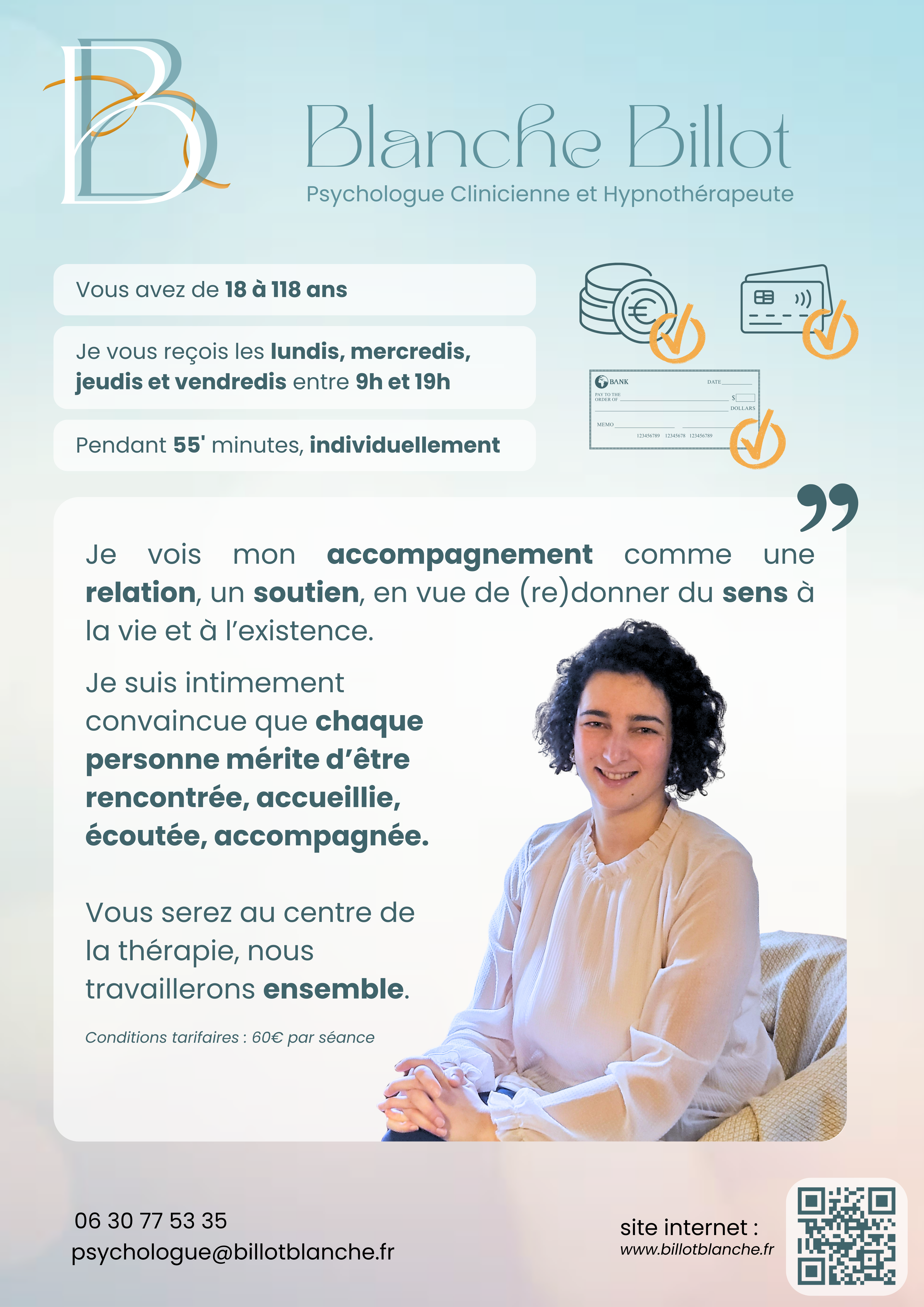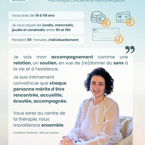 Psychologue clinicienne diplômée et hypnothérapeute, je vous reçois dans mon cabinet en séance individuelle de 55mn (public adulte uniquement).